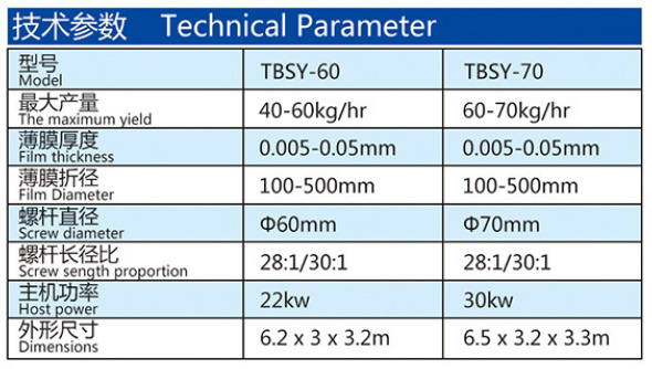 吹制各種規格的低密度聚乙烯、高密度聚乙烯和線性低密度聚乙烯塑料薄膜,廣泛應用于食品百貨、日用、化工、針紡品、購物禮袋和工業包裝。機筒、螺桿采用38CrMoAl合金材料經氮化處理精密加工而成,具有很好的耐磨和耐腐蝕性。